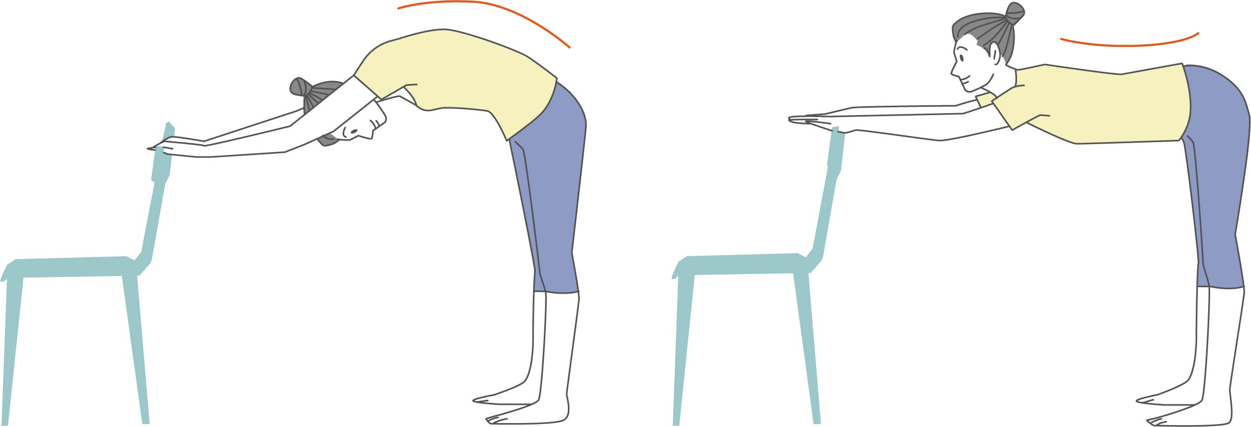 たとえば背中を丸めた姿勢を長く続けると、胸の前側の筋肉が短く硬くなり、背中側の筋肉は引き伸ばされて弱くなりがちです。